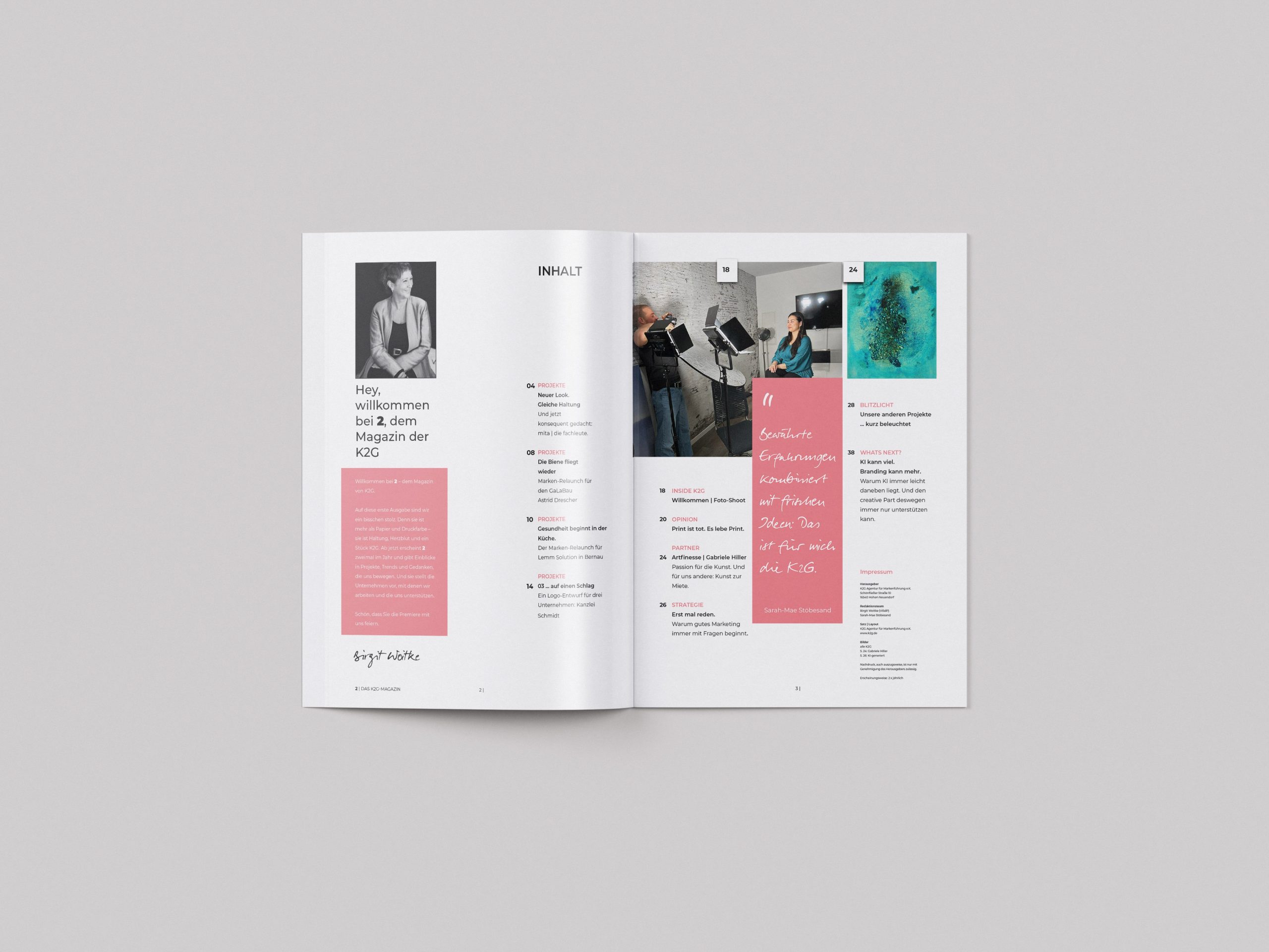 Das Magazin „2“ ist das eigene Magazin der K2G und erscheint zweimal im Jahr. In der ersten Ausgabe bündeln wir spannende Kundenprojekte und aktuelle Neuigkeiten aus unserer Agentur. Gleichzeitig zeigen wir, wie bewährte Erfahrung und neue Perspektiven zusammenkommen. Leserinnen und Leser bekommen Einblicke in Projekte, Trends und Themen, die uns beschäftigen. Auch Unternehmen, mit denen wir zusammenarbeiten und die uns unterstützen, stellen wir im Magazin vor. Für uns ist „2“ mehr als Papier und Druckfarbe – es steht für Haltung, Herzblut und ein Stück K2G.